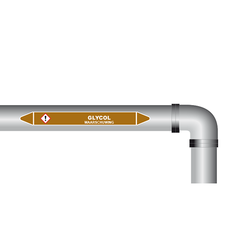 Leidingmarkering voor glycol. Gebruik deze sticker om aan te geven welke leiding als glycol gemarkeerd moet worden. Te gebruiken in ruimtes met ontvlambare vloeistoffen leidingen, bijvoorbeeld in de autoindustrie en medisch laboratorium De sticker is geschikt voor zowel binnen- als buitengebruik. Kies bij buitengebruik de optie “beschermfolie” voor extra bescherming tegen UV straling en water (en dus een langere levensduur).