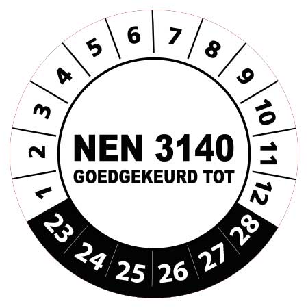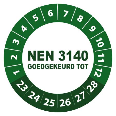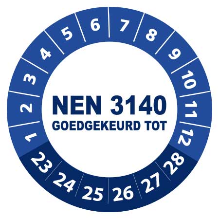 Bestel hier uw ‘NEN 3140 goedgekeurd tot 2023’ keuringsstickers op makkelijk hanteerbare rollen. De stickers hebben een diameter van 3 cm en worden geleverd met een UV beschermlaag. Ze zijn daarom ook geschikt voor outdoor gebruik en kunnen prima tegen een stootje. Heeft u speciale wensen? Bel of mail dan gerust voor een offerte op maat!