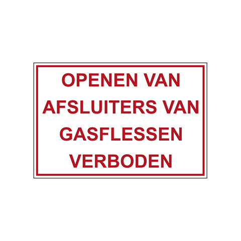 Openen van gasflessen verboden. Gebruik deze sticker om aan te geven dat het verboden is om gasflessen te openen. Te gebruiken in geval van ontploffingsgevaar. De sticker is geschikt voor zowel binnen- als buitengebruik. Kies bij buitengebruik de optie “beschermfolie” voor extra bescherming tegen UV straling en water (en dus een langere levensduur).