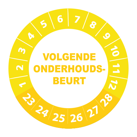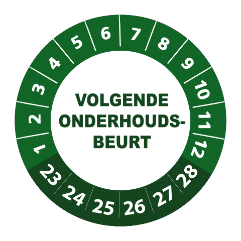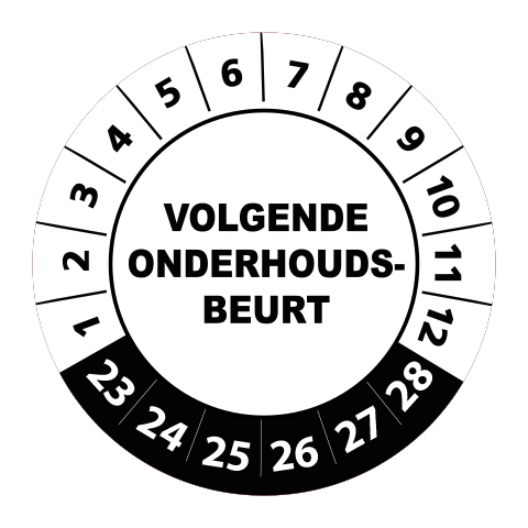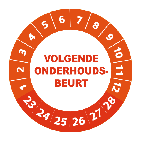 Bestel hier uw ‘volgende onderhoudsbeurt 2023’ keuringsstickers op makkelijk hanteerbare rollen. De stickers hebben een diameter van 3 cm en worden geleverd met een UV beschermlaag. Ze zijn daarom ook geschikt voor outdoor gebruik en kunnen prima tegen een stootje. Heeft u speciale wensen? Bel of mail dan gerust voor een offerte op maat!