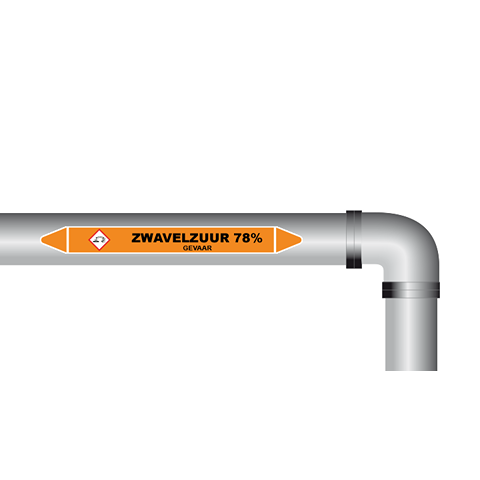 Leidingmarkering voor 78% zwavelzuur. Gebruik deze sticker om aan te geven welke leiding als 78% zwavelzuur gemarkeerd moet worden. Te gebruiken in ruimtes met zwavelleidingen, bijvoorbeeld bij een werkplaats of in de industrie. De sticker is geschikt voor zowel binnen- als buitengebruik. Kies bij buitengebruik de optie “beschermfolie” voor extra bescherming tegen UV straling en water (en dus een langere levensduur).